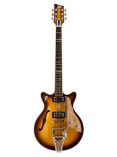 The Duesenberg Alliance Series Joe Walsh boasts numerous details and appointments that are deeply connected to the style and history of its legendary namesake. The Alliance Series Joe Walsh sports a laminated spruce top, laminated flamed maple back and sides, and a solid center block to safeguard against unwanted feedback. You'll appreciate the incredible playing comfort afforded by this semi-hollowbody electric guitar's extra-slim semi-hollow design, which is impeccably matched with an easy-playing Medium "D"-shaped maple neck and an elaborately Plek'd Indian rosewood fingerboard. This guitar is designed to bring out the best in any amp you plug it into, thanks to the one-two punch provided by its Duesenberg LittleToaster and SingleTwin Mini pickups. Duesenberg Z-Tuners and a steel saddle bridge offer rock-solid stability, and the Radiator vibrato really lets your creativity soar. This instrument is replete with custom appointments, which include fingerboard inlays that spell Joe's name in Morse code, a Tibetan Knot graphic between the pickups, and mixed nickel and gold hardware. The Alliance Series Joe Walsh also includes a fetching PUR lacquer finish and Duesenberg's trademark geometrical 3-stepped styling.